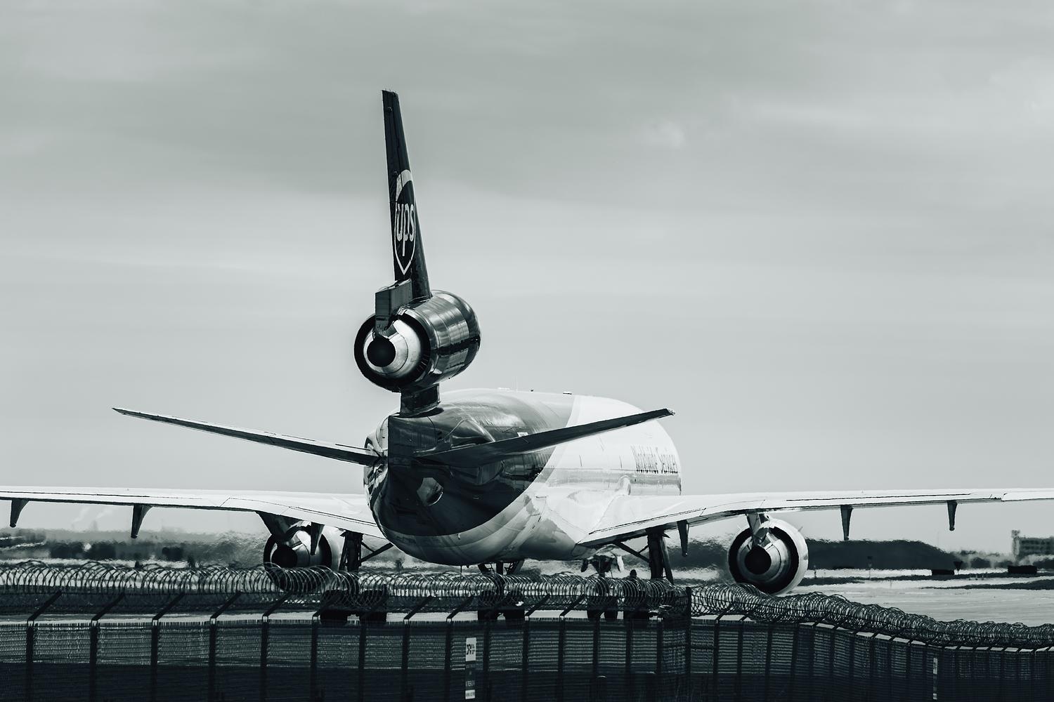 UPS MD-11F showing its iconic triple engine design while taxiing at Dallas Ft-Worth International Airport.