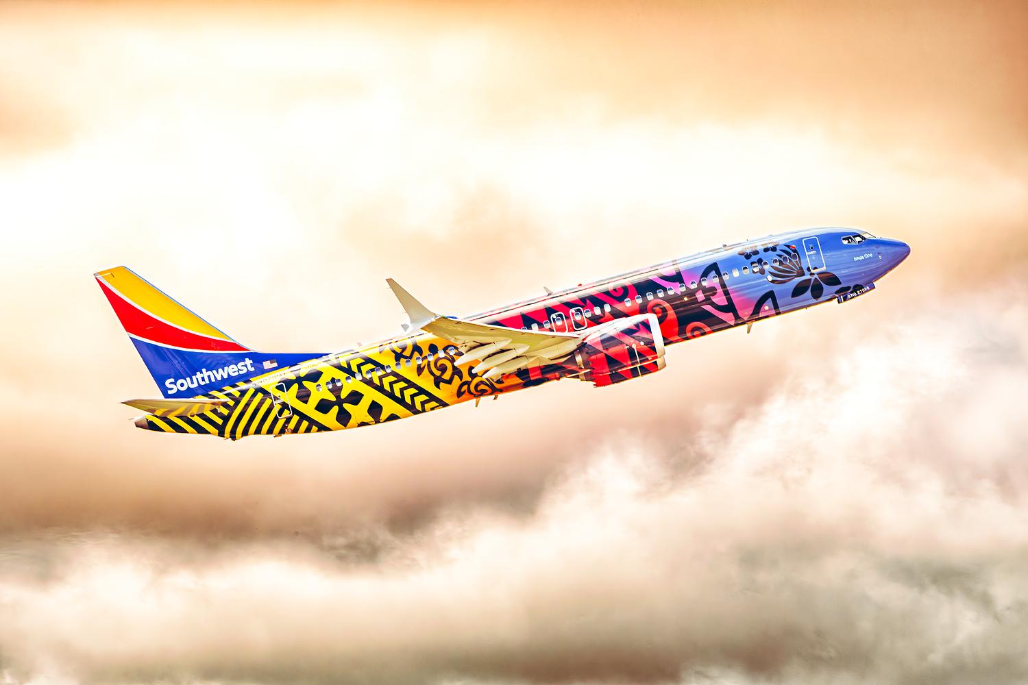 N8710M, Southwest "Imua One" Boeing 737 Max-8 taking off from OKC during a overcast afternoon.