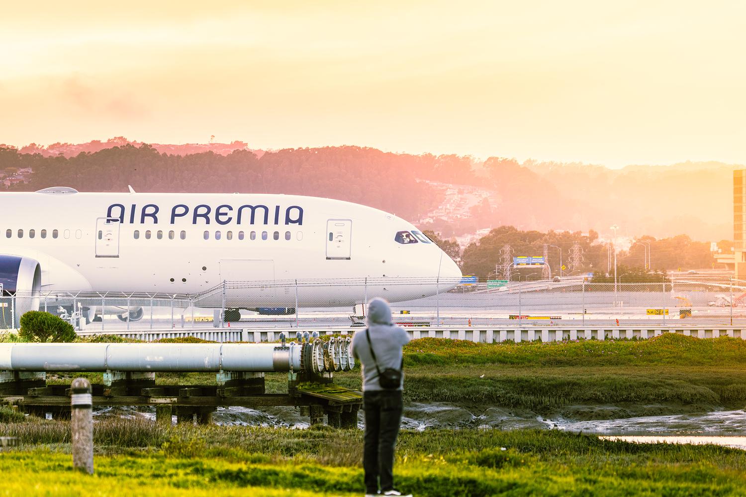 HL8702, Air Premia Boeing 787-9 Dreamliner taxiing at SFO right by the fence near the SF Bay Trail.