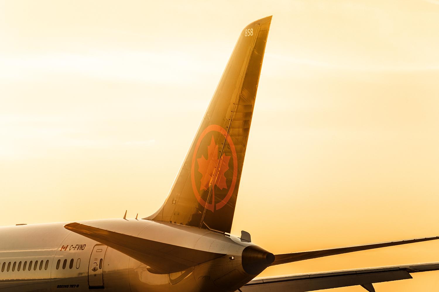 C-FVND, Air Canada Boeing 787-9 Dreamliner tail closeup on a sunset evening at Vancouver International Airport.